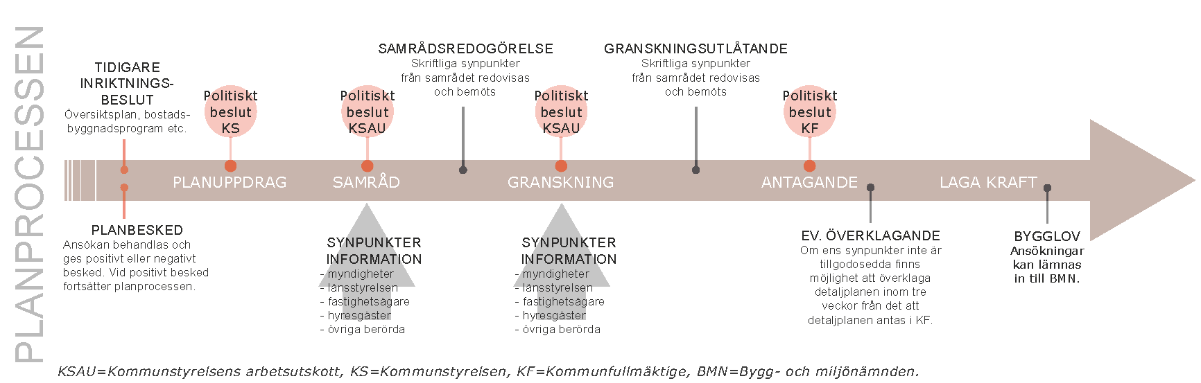 När en detaljplan ska tas fram följs en reglerad process enligt plan- och bygglagen (PBL). Syftet är att ge berörda insyn i planarbetet och förankra planförslaget. Under samråd och granskning kan allmänheten lämna skriftliga synpunkter på planförslaget. Information om samråd och granskning kungörs på kommunens webbplats och i lokal tidning.
